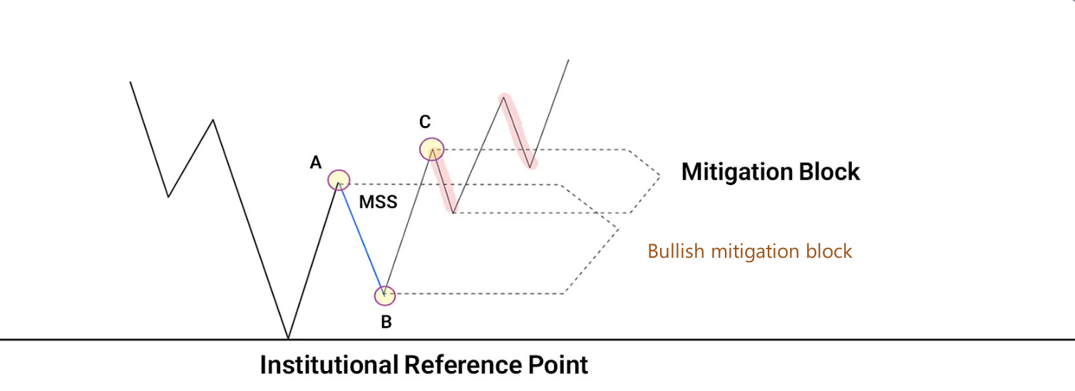 The last bearish candle or small zone before this break becomes the Bullish Mitigation Block.